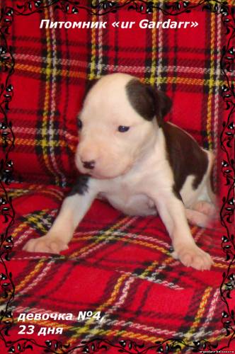 | ЕСТЕРИ БЛАР ур Гардарр (или Чёрная Звезда из Города Воинов) Дата рождения: 26.12.2011 Окрас: коричнево-белая Документы: щенячка УКФ, клеймо, международный вет.паспорт.